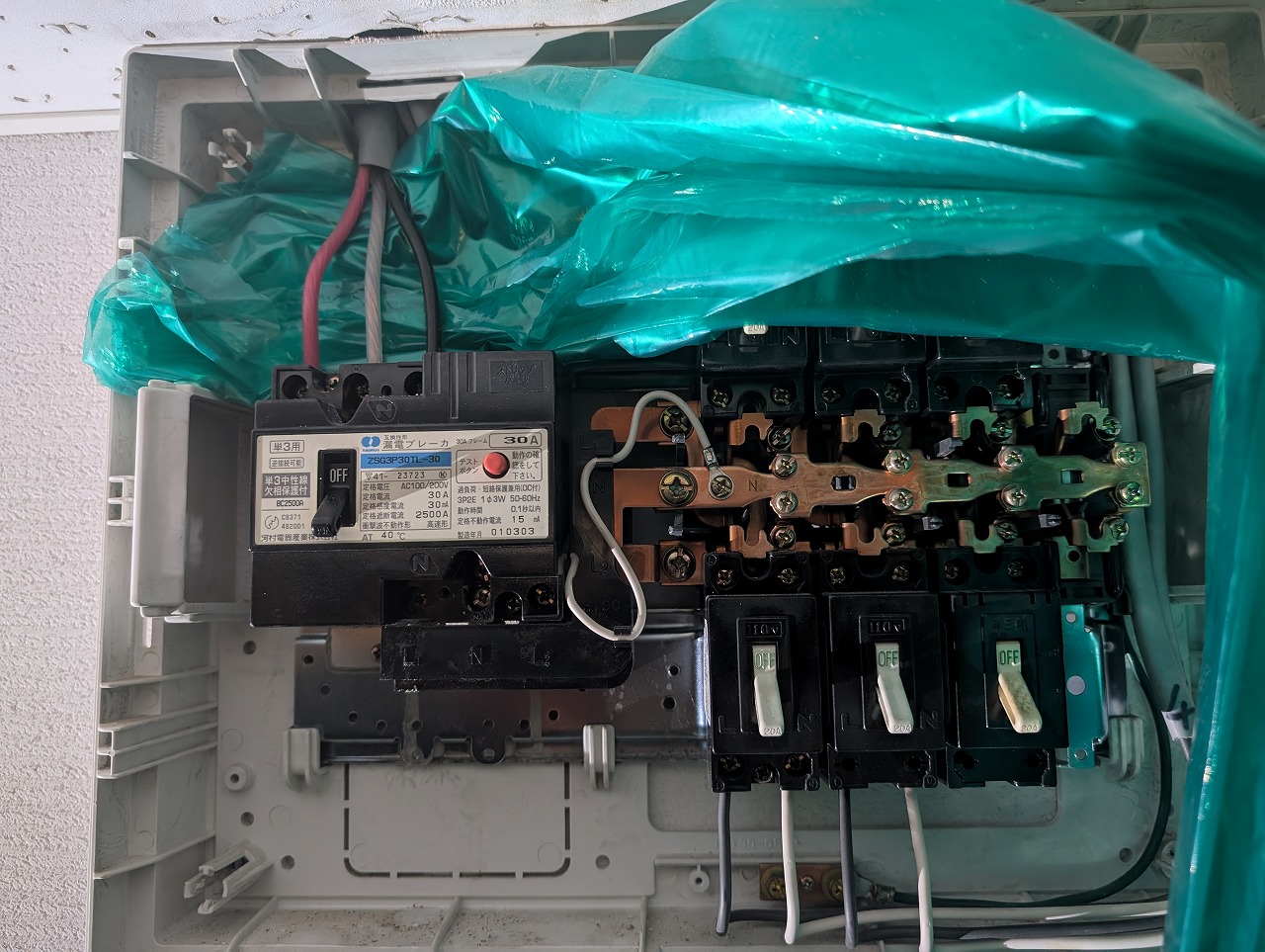 今回は主幹ブレーカー(漏電ブレーカー)1次側より上のブレーカー(電源)を落とすことができなかったため、活線(主ブレーカーの電源線が通電した状態)で取替作業を行いました。